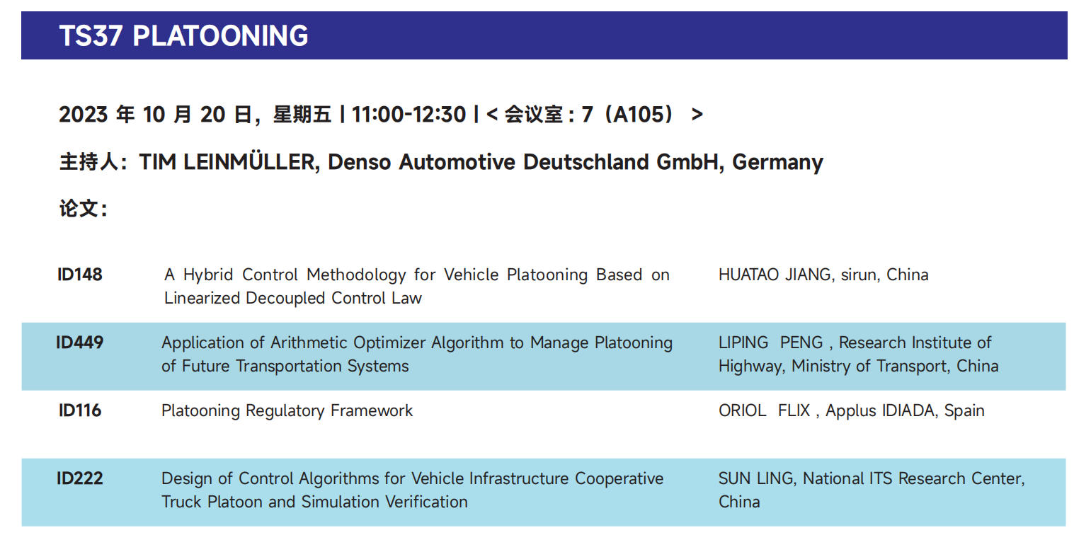 經(jīng)過ITS國際組委會的專業(yè)遴選,該論文成功入選第29屆智能交通世界大會。10月20日上午,斯?jié)櫶炖蕦⑹苎麉⒓蛹夹g(shù)論文會議:TS37 Platooning,屆時將對論文內(nèi)容進行技術(shù)解讀,并介紹斯?jié)櫶炖试?/span>V2X網(wǎng)聯(lián)環(huán)境下車輛列隊行駛方面所做的相關(guān)工作。